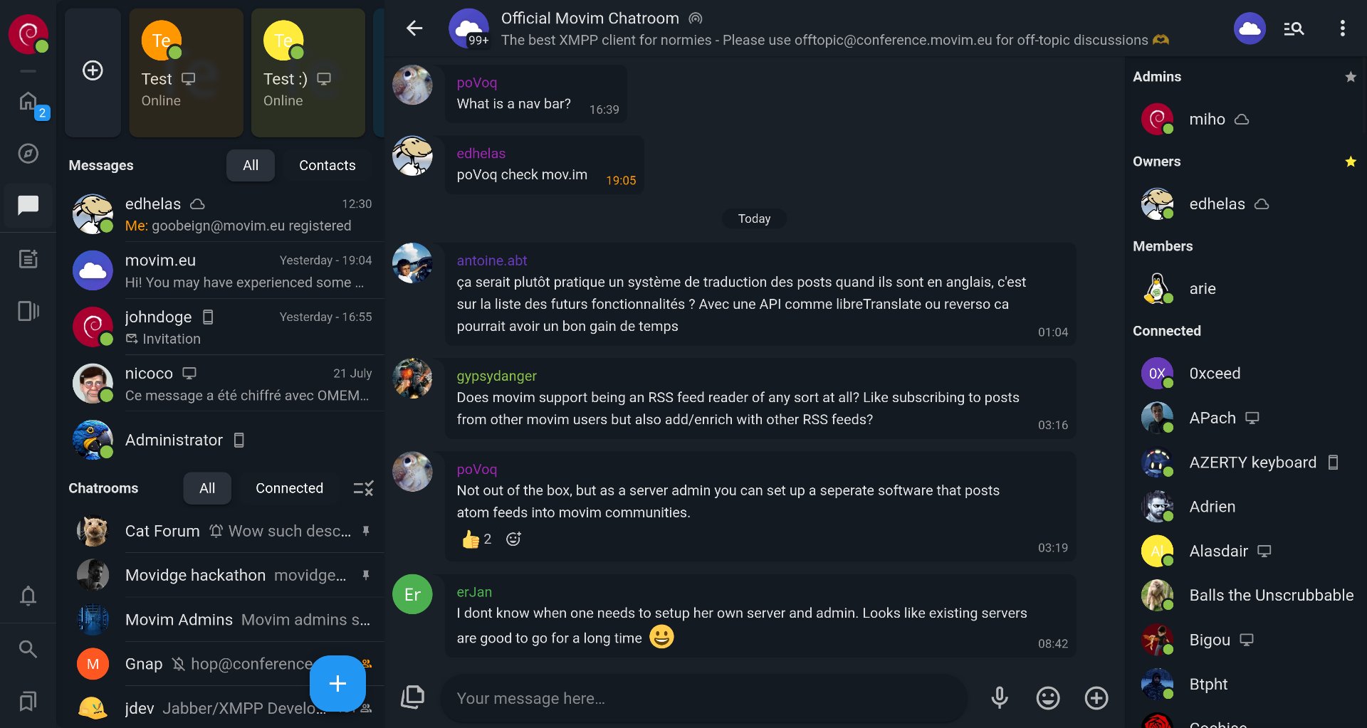 So! It means that the Prosody, Tigase, MongooseIM, OpenFire, ejabberd XMPP servers (yes there are many of them already) that host the millions of accounts, including yours (movim.eu is using ejabberd) can already allow you to do microblogging, publish long articles, photos, messages, do video-conferencing... out of the box. How convenient! ✨